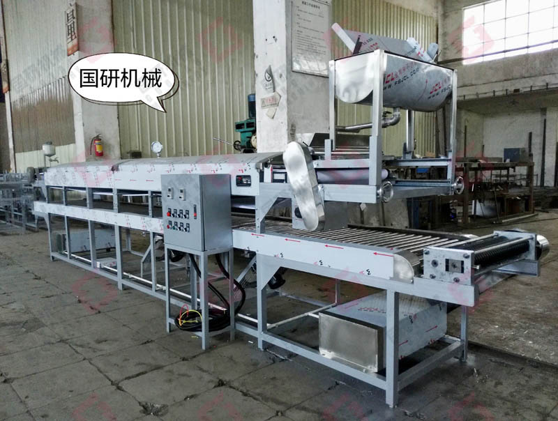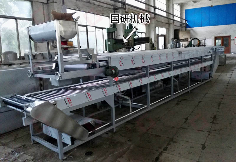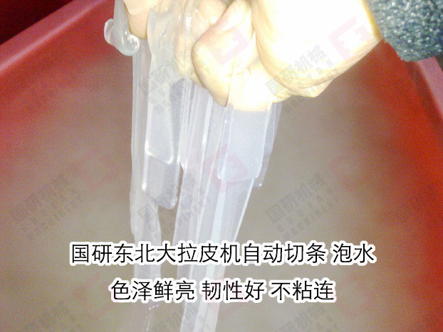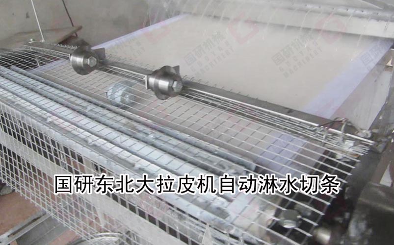 國研牌東北大拉皮機(粉皮機)采用自動下漿、蒸汽蒸熟,自動淋水分離 ,自動切條、切片(根據客戶的需要訂制)。生產過程可不需要專人操作,自動化生產。生產的拉皮晶瑩剔透,韌性強,口感好,生產效率高。每公斤淀粉可生產拉皮4.5-5.5公斤,該系列產品有多個規格,適合不同投資規模的客戶需求,辦食品加工廠,餐飲連鎖店,單位或學校食堂適用。
