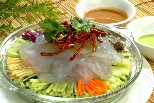 5.吃的時候將拉皮從水中取出切成寬條,放入備好的各種絲、炒好的肉絲和兌好的調料汁,再放入少許鹽拌勻就可以吃了,在飯店吃或者做宴客菜,就將所有的絲墊底,上面放拉皮,炒好的肉絲放到拉皮上,再澆上調料汁,吃的時候再拌勻就可以了